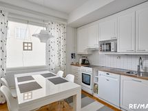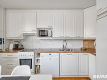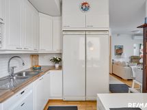 - Jääkaappi, pakastin, keraaminen liesi, liesituuletin, astianpesukone (2021). Seinät kaakeli (välitila) ja maali. Parkettilattia.