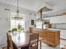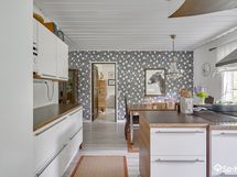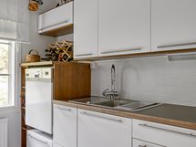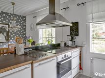 - Keittiön varusteet: Keittiösaareke, erillisuuni, liesituuletin (hormi), liesi (keraaminen liesitaso uusittu 2021), astianpesukone ja festivon kylmiö. Työtason materiaali: Laminaatti.