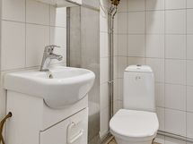 - Pesutilojen kuvaus: Suihku, peilikaappi, pesuallas, allaskaappi, wc-istuin, lämminvesivaraaja (uusittu 2-3 vuotta sitten). Seinät kaakeli. Laattalattia.