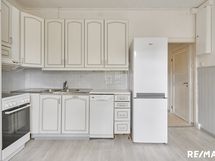- Iso keittiö. Kaapistot, jääkaappi /pakastin, sähköliesi, liesituuletin, astianpesukone. Seinät kaakeli, paneeli, maali. Laminaattilattia.