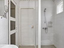 - Kiuas: Sähkökiuas. Saunaosaston yhteydessä kylpyhuone, jossa suihku, wc istuin, peilikaappi, pesuallas ja allaskaappi.