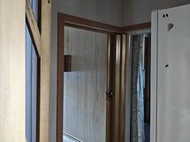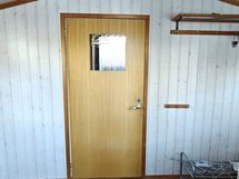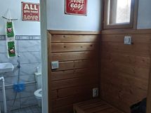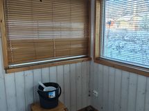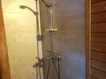 Kuvaus: Puulämmitteinen sauna, jossa myös suihku ja suihkuseinä. Laattalattia.