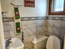 Erillisen WC:n kuvaus: Wc-tila, jossa wc-istuin, pesuallas, peili, bideesuihku. Laattalattia.