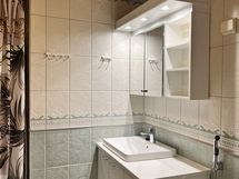 - Suihku, Pesukonevalmius, Peilikaappi, Allaskaappi, Lattialämmitys, Laattaseinä, Laattalattia