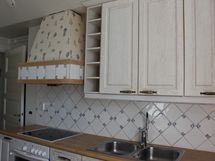 - Tilaa isolle ruokapöydälle, Paljon kaappitilaa, Suuri tiskipöytä, Lasikaapit, Laminaattitasot, Pesukoneliitos, Sähköliesi, Keraaminen liesi, Jää-pakastinkaappi, Liesituuletin, Paljon työskentelytilaa