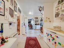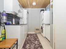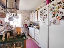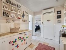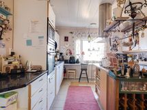 - Jääkaappi, pakastekaappi arkkupakastin, erillisuuni, keraaminen liesi, liesituuletin, mikroaaltouuni, astianpesukone, kaapistot, kiinteät valaisimet, pöytätasojen materiaali laminaatti / saareke umpipuuta.