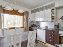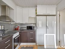 - Jääkaappi/pakastin, keraaminen liesitaso, liesituuletin, astianpesukone. Seinät välitila taustalevy (alla laatta), maali. Lattia muovimatto.
