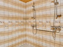 PH2: Suihkut 2 kpl, peilikaappi, pesuallas, allaskaappi, patteri, suihkuseinät. Seinät kaakeli. Laattalattia.