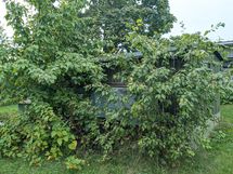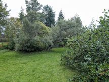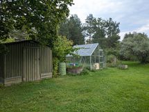 nurmikko, marjapensaat, istutukset, omenapuita, kasvihuone.