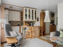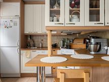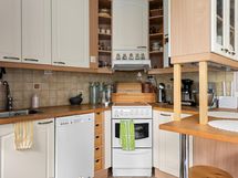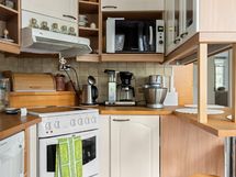 - Jääkaappi/pakastinkaappi, keraaminen liesi, uuni, liesikupu/-tuuletin, astianpesukone, astianpesukoneliitäntä, allas ja hana, keittiön kaapistot ja tasot