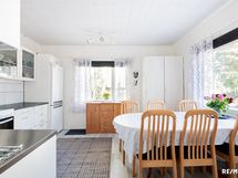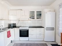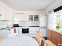 - Jääkaappi/pakastin, keraaminen liesi, liesituuletin, astianpesukone, välitila laatta, pöytätaso laminaatti, lattia laminaatti, seinät maali.