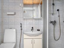 - Kylpyhuone, suihku, suihkuseinä, peilikaappi, pesukoneliitäntä, lattialämmitys (vesikiertoinen), peili (erillinen wc), kiinteät valaisimet