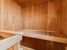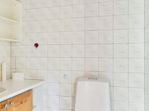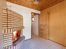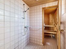Sauna, sähkökiuas, kylpyhuone, suihku, pesukoneliitäntä.