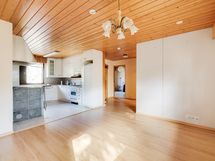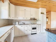 Jääkaappi, lattialiesi, liesituuletin, astianpesukone, kaapistot uusittu v. 2009, keittiön tulisija asennettu 2002, nuohous 2025, keittiön lattialämmitys v. 2009.
