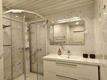 - Pesutilojen kuvaus: Yläkerrassa kylpyhuone, jossa suihkukaappi.