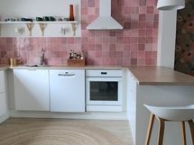 Tilaa isolle ruokapöydälle, Suuri tiskipöytä, Paljon työskentelytilaa, Laminaattitasot, Astianpesukone, Integroidut koneet, Liesisaareke, Liesituuletin, Induktioliesi, Jää-pakastinkaappi