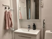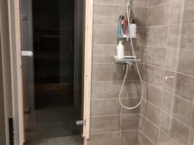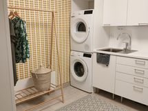 Suihkuseinä, Suihku, Pesukone, Kuivausrumpu, Peilikaappi, Allaskaappi, Laattalattia, Laattaseinä