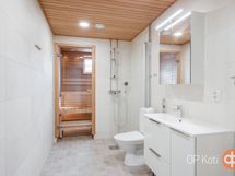 Sauna, sähkökiuas, kylpyhuone, erillinen wc, suihku, suihkuseinä, peilit, pesukoneliitäntä, lattialämmitys, kiinteät valaisimet.