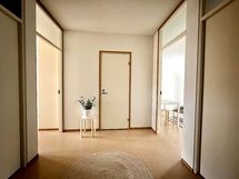 Eteisaula käytännöllinen ja tilava, ihanne lapsiperheellä. Eteisen lattiassa vaalea laminaatti, muuten asunnossa muovimatot.Tuulikaapista käynti vaatehuoneeseen.