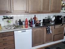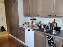 Paljon kaappitilaa, Suuri tiskipöytä, Astianpesukone, Sähköliesi, Liesituuletin, kylmiö