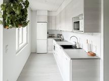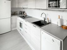 Jääkaappipakastin, erillisuuni, induktioliesi, liesikupu, astianpesukone, kaapistot, kiinteät valaisimet.