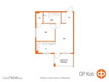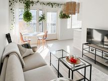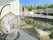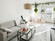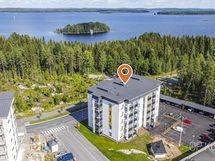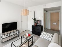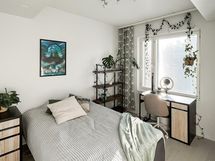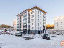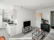 Tässä 2. kerroksen valoisassa huoneistossa on yhtenäinen olohuone-keittiötila, makuuhuoneeseen mahtuu hyvin parivuode sekä pieni työpiste, makuuhuoneen yhteydessä vaatehuone. Materiaalit on valittu huolella ja niissä on huomioitu kestävyys sekä helppohoitoisuus. Keittiön varusteisiin kuuluvat mm. astianpesukone ja erillisuuni sekä induktioliesitaso. Olohuoneesta käynti tilavalle lasitetulle parvekkeelle. Asunnossa on hyvät säilytystilat ja lisäksi huoneistolle kuuluu oma häkkivarasto.