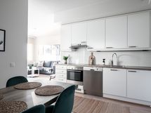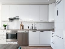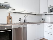 - Liesi: integroitu, erillisuuni. Työtasot: laminaatti. Kylmäsäilytys: jääkaappi/pakastin. Varustus: astianpesukone, kiinteät valaisimet, liesituuletin / hormi. Vaalea keittiö, Siemensin kodinkoneet. Liesituulettimesta hallinnoidaan myös huoneiston ilmanvaihtoa.