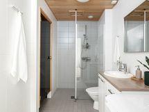 - Varustus: suihkuseinä, pesukoneliitäntä, lattialämmitys, wc-istuin, suihku, peili, kiinteät valaisimet, kylpyhuonekaapisto, asennettuja erikoisvarusteita.