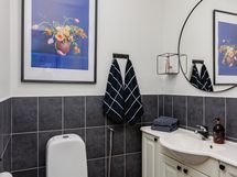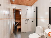 - Sauna, sähkökiuas, kylpyhuone, erillinen wc, suihku, suihkuseinä, peilit, allaskaappi, pesukoneliitäntä, lattialämmitys, kiinteät valaisimet.