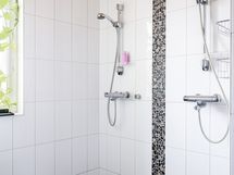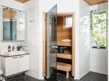 Varustus: wc-istuin, 2x suihku, peilikaappi, allaskaappi, pesukoneliitäntä, kiinteät valaisimet, bidee-suihku, pöytätasoa ja ylä-ja alakaapistot. Erillisen WC:n kuvaus: varustus: wc-istuin, peilikaappi, allaskaappi, bidee-suihku.