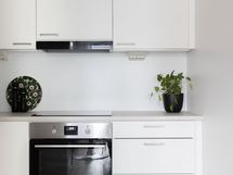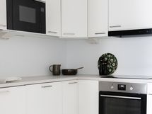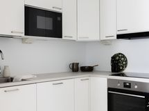 Liesi: induktio, erillisuuni. Työtasot: laminaatti. Kylmäsäilytys: jääkaappi/pakastin. Varustus: liesituuletin, astianpesukone, kiinteät valaisimet. Keittiön lattiamateriaali vinyylilankku