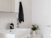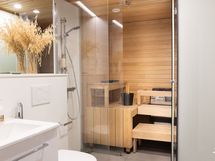 Varustus: suihkuseinä, kuivauskaappi, lattialämmitys, wc-istuin, suihku. Varustus: lattialämmitys, peilikaappi, bidee-suihku.