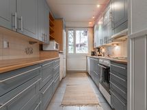 - Keittiön varusteet: Jääkaappipakastin, jääkaappi, liesi (sähköliesi uusittu 2022) ja astianpesukone (uusittu 2022)
