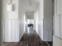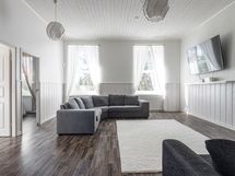 Lattia: Pesutiloissa: laatta. Olohuoneessa: laminaatti. Saunassa: laatta. Seinät: Pesutiloissa: kaakeli.