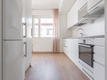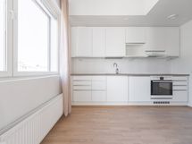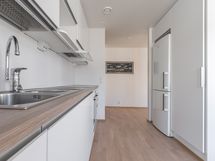 - Keittiön varusteet: Jääkaappipakastin, astianpesukone ja liesituuletin. Liesi: Keraaminen liesi. Työtason materiaali: Laminaatti.