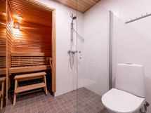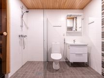 - Pesutilojen varusteet: WC-istuin, suihku, peilikaappi, pesuallas, bidee-suihku, lattialämmitys, suihkuseinä ja pesukoneliitäntä.