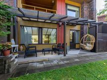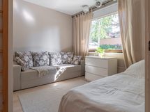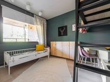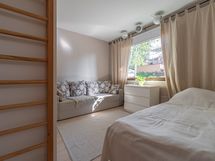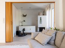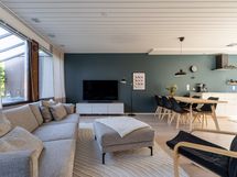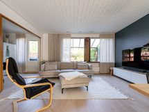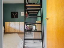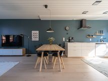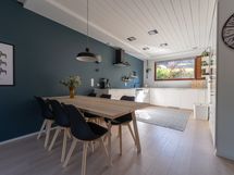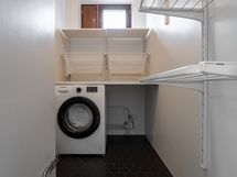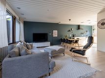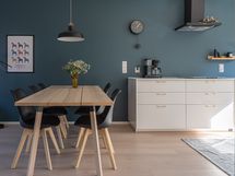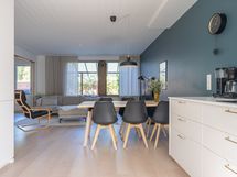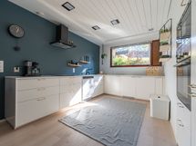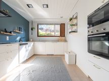 - Keittiön varusteet: Jääkaappipakastin (integroitu kalusteeseen), astianpesukone, erillisuuni ja mikroaaltouuni. Liesi: Induktioliesi. Työtason materiaali: Laminaatti. Remontoitu, vaaleat kaapit, katto valkoiseksi maalattu puupaneeli.