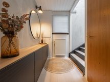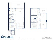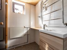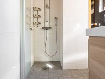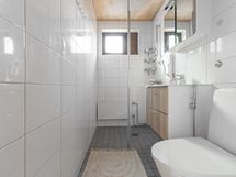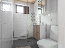 - Pesutilojen varusteet: Suihku, lattialämmitys, suihkuseinä, pesukoneliitäntä, allaskaappi, bidee-suihku ja wc-istuin. Pesutilojen kuvaus: Alakerrassa ja yläkerrassa kylpyhuone. Yläkerran kylpyhuoneessa toinen WC. Molemmissa ikkuna. Erillisten WC:n lukumäärä: 2. Erillisen WC:n varusteet: WC-istuin, allaskaappi ja peilikaappi. Erillisen WC:n kuvaus: wc ala- ja yläkerrassa.