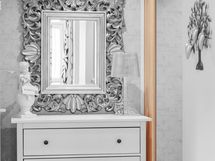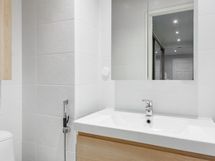 Sauna, sähkökiuas Harvian tornikiuas, kylpyhuone, erillinen wc, suihku, peilikaappi, kaapit, allaskaappi, pesukoneliitäntä, kiinteät valaisimet.
