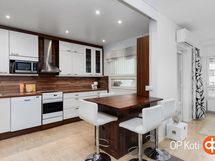 Jääkaappipakastin, keraaminen liesi, liesituuletin aktiivihiilisuodatin, astianpesukone, kaapistot, kiinteät valaisimet. saarekepöytä