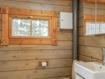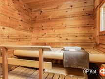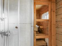 Sauna, sähkökiuas, kylpyhuone, erillinen wc, suihku, suihkukaappi, peilikaappi, kaapit, allaskaappi, pesukoneliitäntä, lattialämmitys, kiinteät valaisimet.
