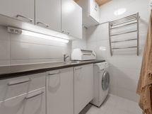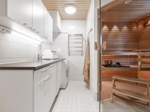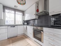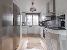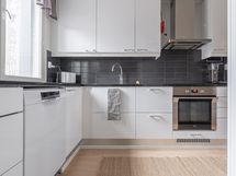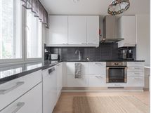 - Keittiön varusteet: Jääkaappi, erillinen pakastin, liesi, liesituuletin ja astianpesukone. Liesi: Induktioliesi. Työtason materiaali: Kivi.