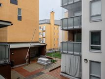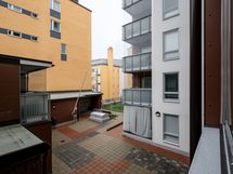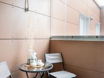 Lasitettu parveke avautuu taloyhtiön sisäpihan puolelle, jossa voi nauttia aamukahvit tai ilta-auringon viimeiset säteet. Näkymä on urbaani. Ympärillä näkyy keskustan rakennuksia – mutta juuri siinä piilee kodin viehätys: olet osa elävää, hengittävää kaupunkia.