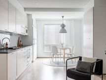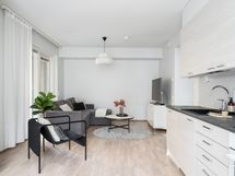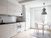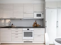 Keittiö ja olohuone yhdistyvät viihtyisäksi oleskelutilaksi, jossa on helppo viettää aikaa perheen tai ystävien kanssa. Keittiön varustuksessa on täysikorkeat jääkaappi ja -pakastin sekä kaksilehtisen oven taakse kätkeytyvä aamiaiskaappi.