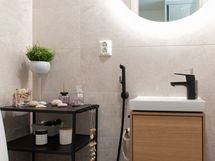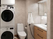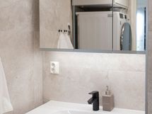 Lattialämmitys + Pesukoneliitäntä, mustat hanat ja suihkut. Erillisen WC:n kuvaus: Pukkilan laatat, bidee, allaskaappi, valopeili, musta hana.
