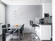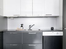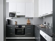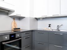 Liesi: induktio, erillisuuni. Kylmäsäilytys: jääkaappi/pakastin. Varustus: liesituuletin, astianpesukone, kiinteät valaisimet.