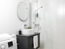 Varustus: pesukoneliitäntä, lattialämmitys, wc-istuin, suihku, peili, kiinteät valaisimet, kylpyhuonekaapisto.