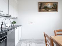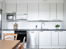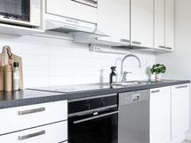 - Liesi: integroitu, erillisuuni. Kylmäsäilytys: jääkaappi/pakastin. Varustus: liesikupu, astianpesukone, kiinteät valaisimet.
