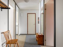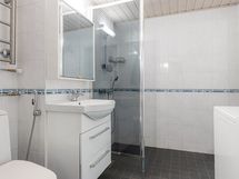 - Pesutilojen varusteet: WC-istuin, suihku, suihkuseinä, pesukoneliitäntä, peilikaappi ja kuivauspatteri seinällä sekä pystykaappi.