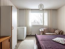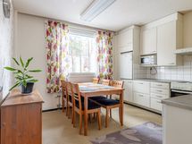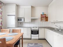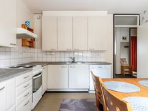 - Keittiön varusteet: Jääkaappi, liesi (/uuni, sähkö), astianpesukone (Bosch) ja liesituuletin. Perinteinen tilava keittiö.